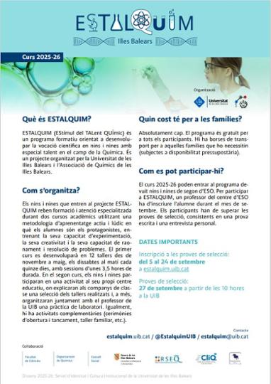 ESTALQUIM (EStímul del TALent QUÍmic) és un programa formatiu orientat a desenvolupar la vocació científica en nins i nines amb especial talent en el camp de la Química. És un projecte organitzat per la Universitat de les Illes Balears i l’Associació de Químics de les Illes Balears, amb la col·laboració de la FECYT.
